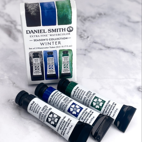 This set includes three 5ml tubes of watercolor paint. Explore the quiet beauty of winter with this atmospheric palette. Granulating Lunar Black adds texture and shadow, French Ultramarine offers a deep chill, and Cascade Green brings the icy, organic tones of frost and forest. Ideal for serene snowscapes and bold contrast.